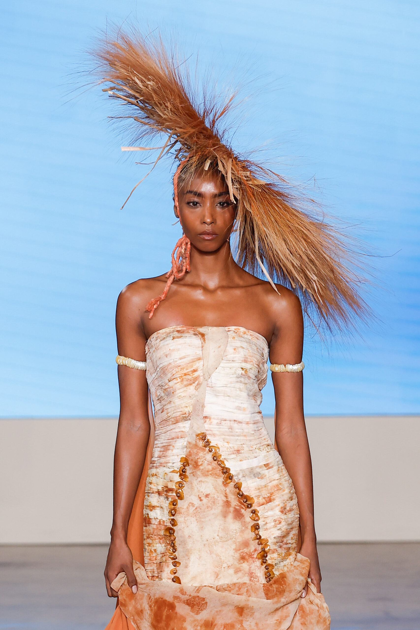 A estilista Camila Machado abre a passarela com o desfile de encerramento com a coleção 2025. Suas criações traduzem a estética sensível e seu compromisso com uma moda que respeita a natureza.