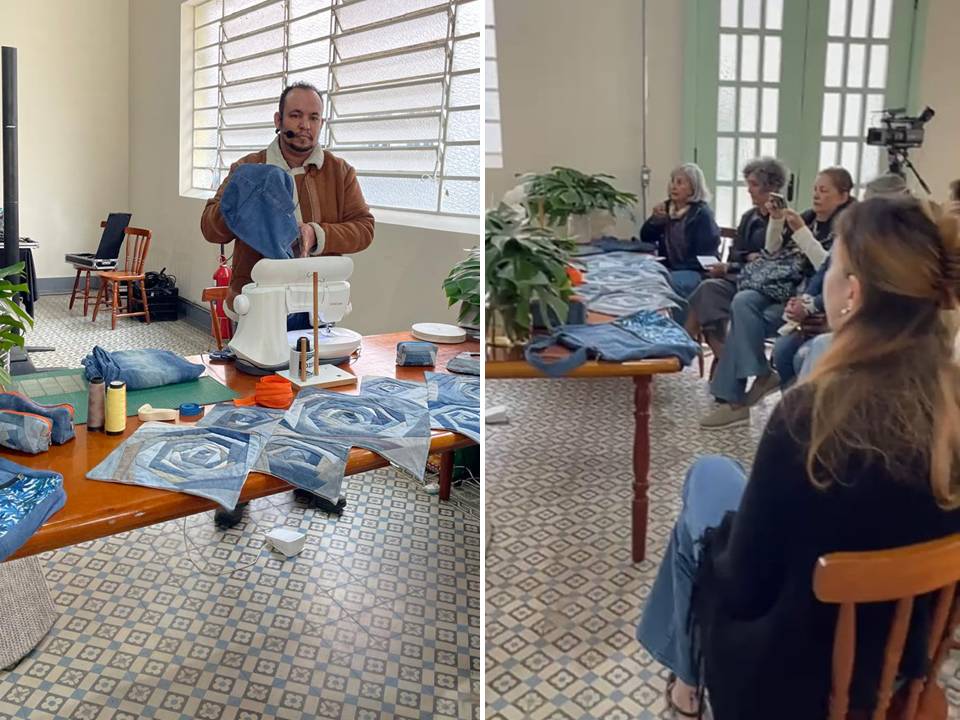 “Técnicas de reaproveitamento têxtil no vestuário, acessórios e decoração”. A manhã do dia 24 de julho foi de muito aprendizado. Daniela Cambuzano e Diego Souza, Gestor da Moda, Modelista e Costureiro ministram workshop para aprendizes e artesãs experientes conhecerem novas formas de ressignificar o jeans, um dos tecidos mais resistentes a se decompor na natureza e a cultura upcycling se faz mais do que necessária.