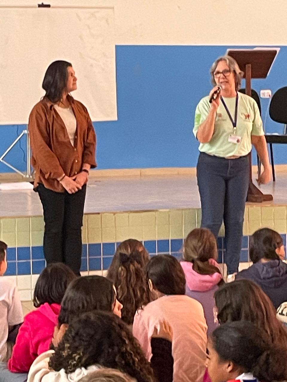 Crédito: Sílvia Regina de Toledo Cabral e Andrea Sundfeld no palco apresentando a autora para as crianças, Acervo No More